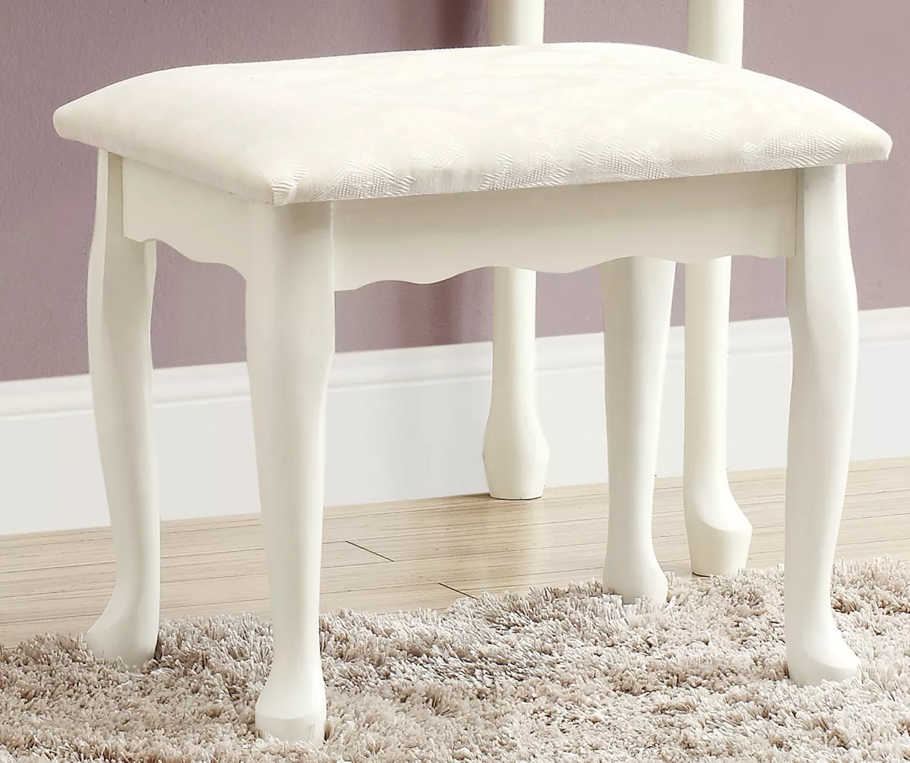- Stool is upholstered in smooth antique white floral fabric