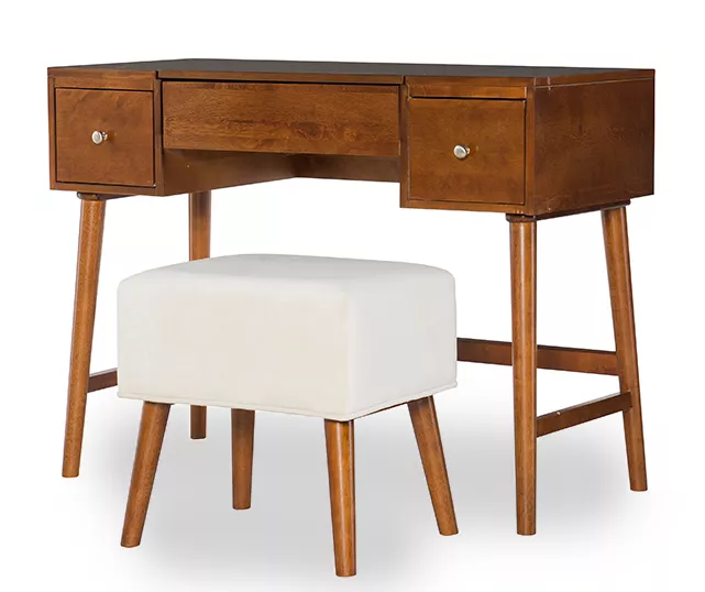 This striking vanity set combines a rich walnut finish with linear design to create a dynamic example of mid-century modern style. For added convenience, two storage drawers keep jewelry and makeup organized and tucked away while the flip top opens to reveal a spacious compartment to house all your beauty tools. Simple silver knobs and an upholstered bench complete the look.