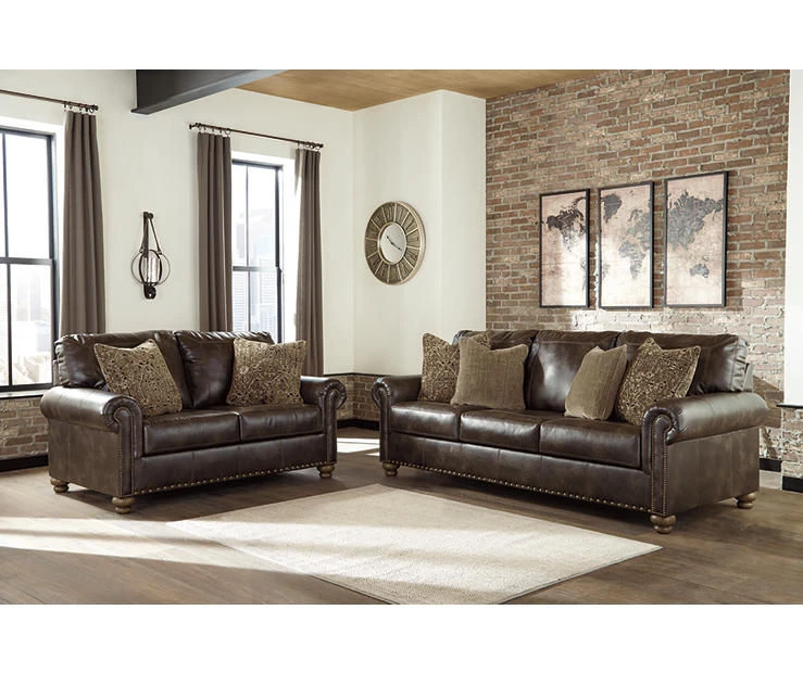 Enticing with a coffee brown faux leather, beautified with a gently weathered effect and designer stitching, the Nicorvo sofa merges a richly traditional sense of style with modern comfort. Roll arms, turned bun feet and prominent nailhead trim incorporate distinctive character. Four plush accent pillows are a sumptuous touch.