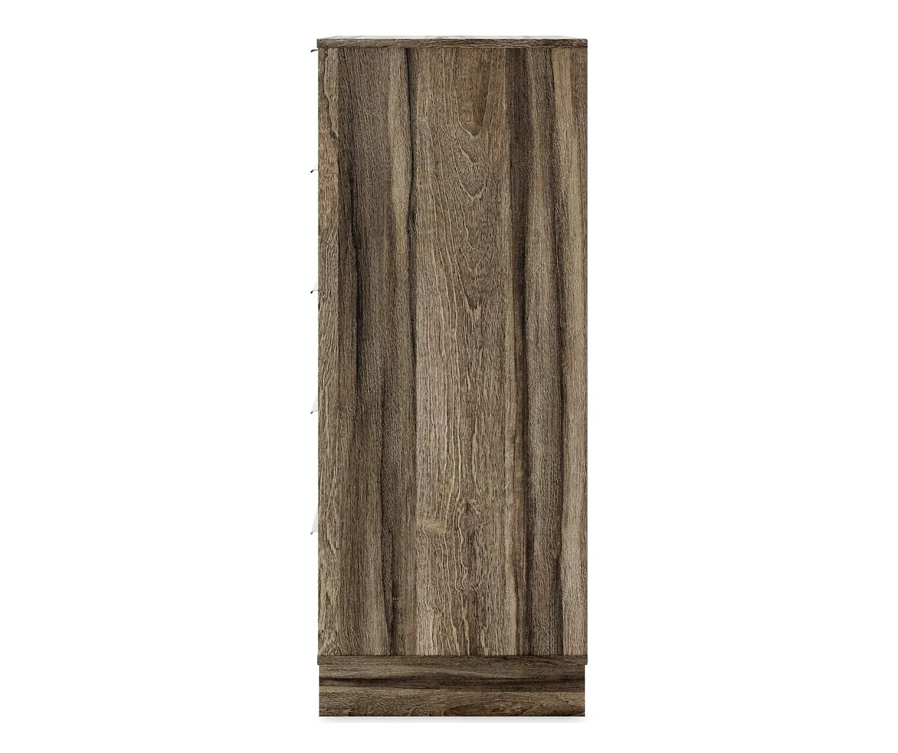 Your modern sanctuary is within reach. The subtle design of the Shallifer chest is accented with a low profile base. Its weathered brown finish is complemented with refined champagne-colored handles on the five smooth-gliding drawers.