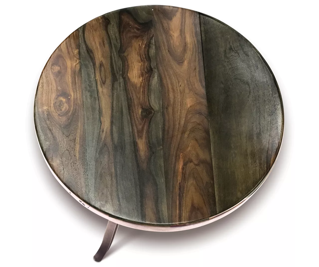 • Sheesham wood top in russet and gray tones- Black powder coated cast iron base